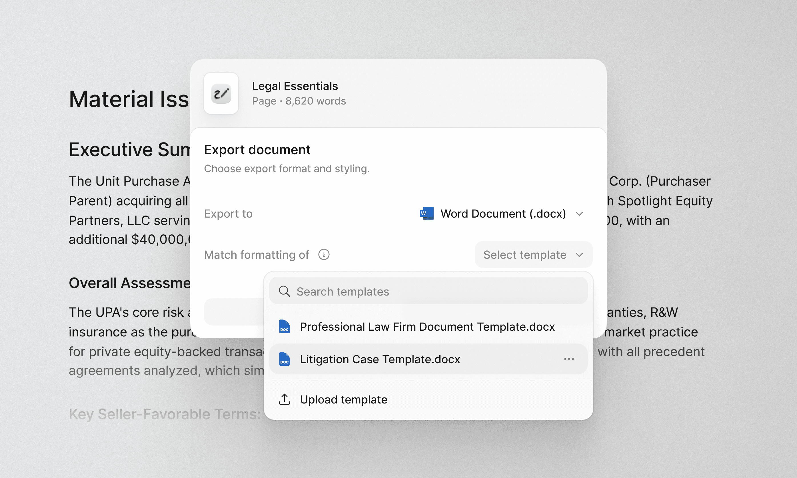 Editor is Legora’s dedicated drafting environment. It lets you draft legal documents directly where your analysis already lives, edit and refine with both colleagues and Legora in real time, and export to Word using your own templates and formatting.