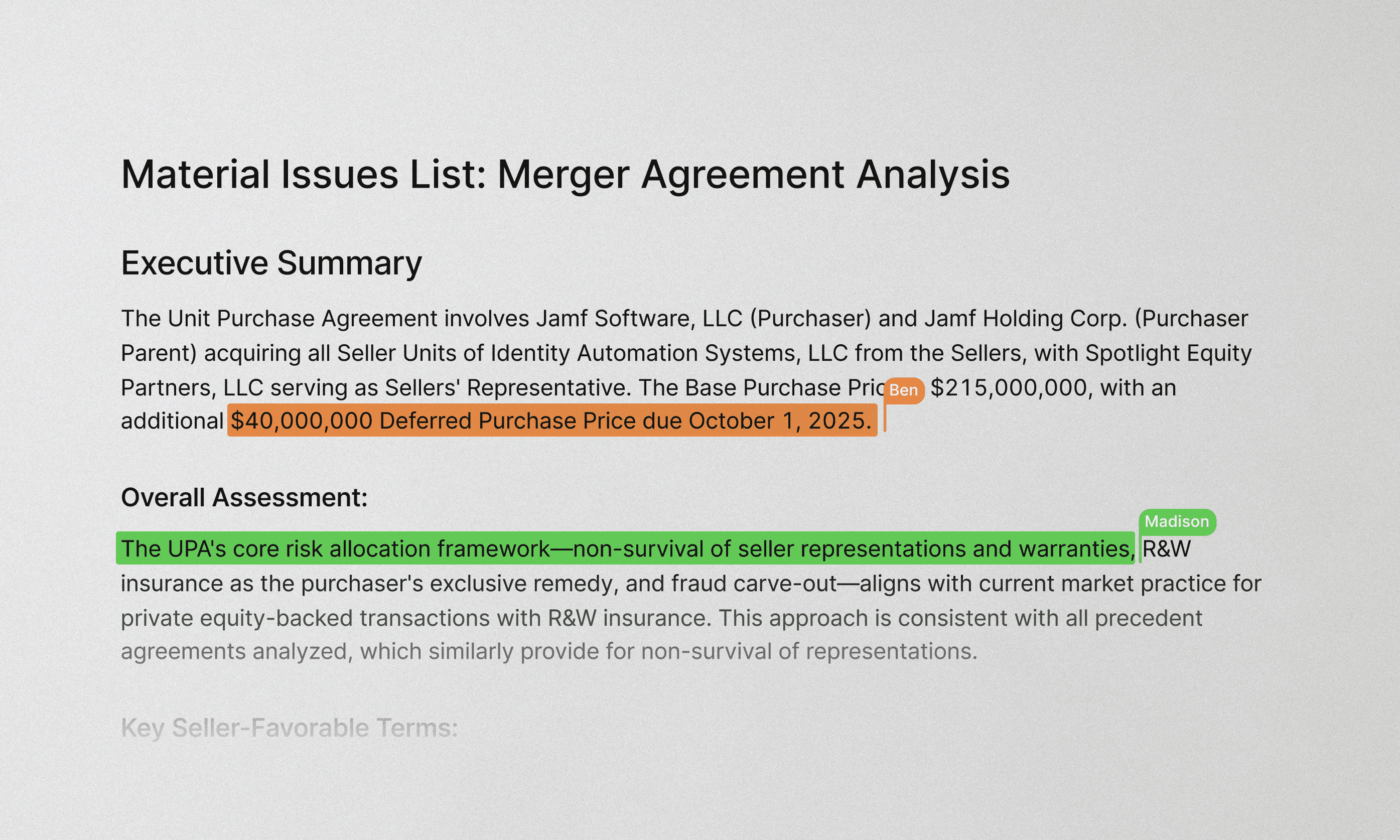 Invite colleagues into the document. Review suggestions from both Legora and your team side by side. Accept or reject changes with full visibility into what has been modified and why. Keep discussion tied to the text, not spread across inboxes.