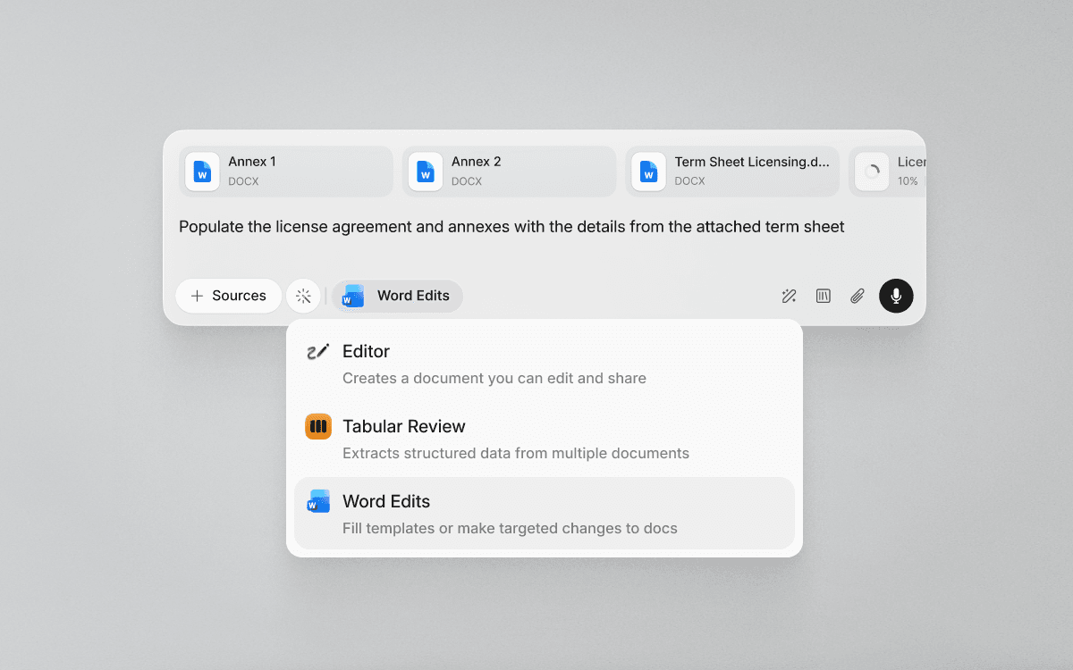 Select Word Edits in the Legora Assistant to make make precise document edits through conversational instructions.