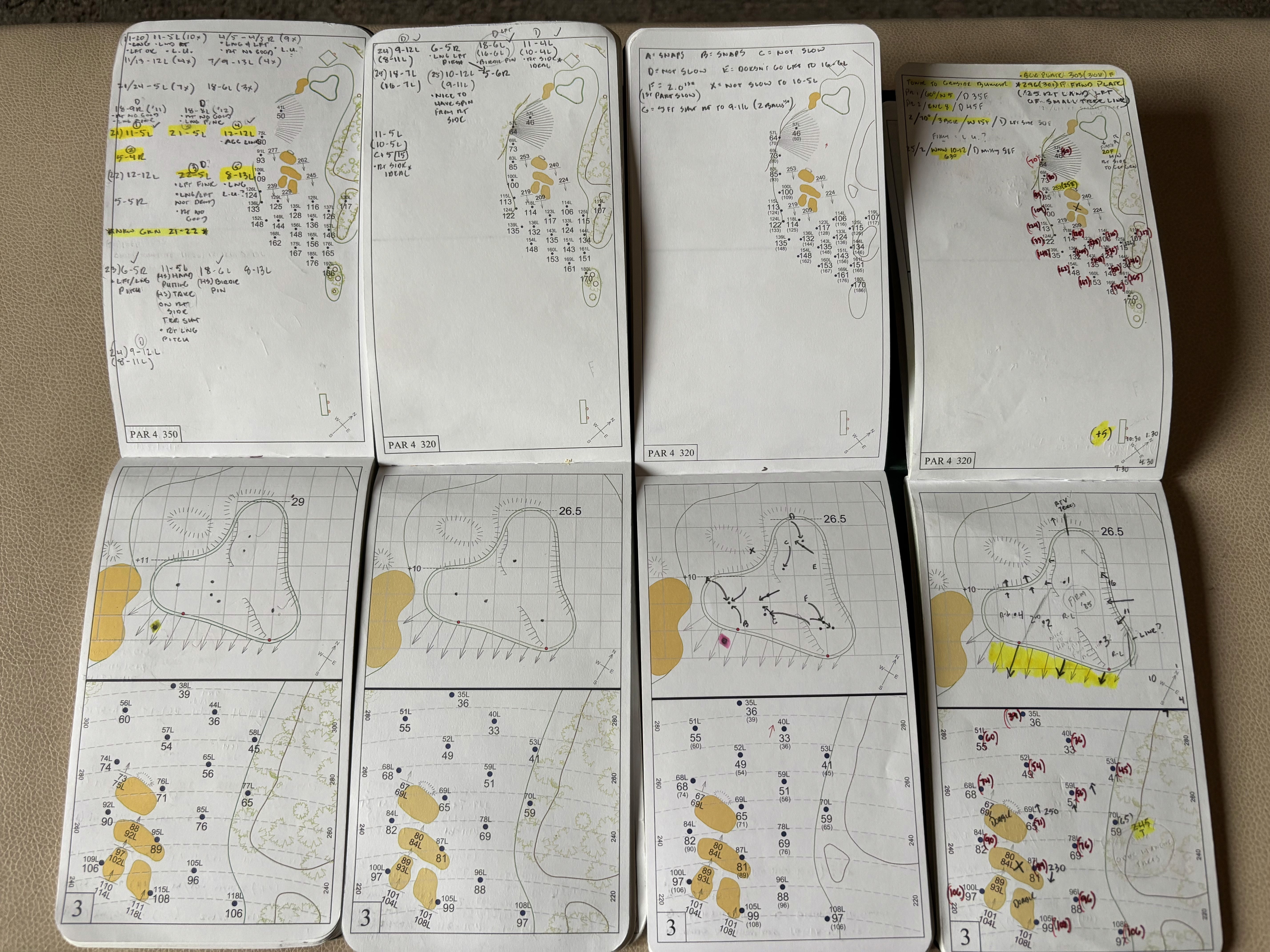 Skovron has been to Augusta so many times that he now carries three yardage books for the course: one provided by the club with the numbers for the given year, one with notes on former pin positions and other hacks collected over the years, and one dedicated to green reads and subtle putting observations. For some holes there's even a fourth.