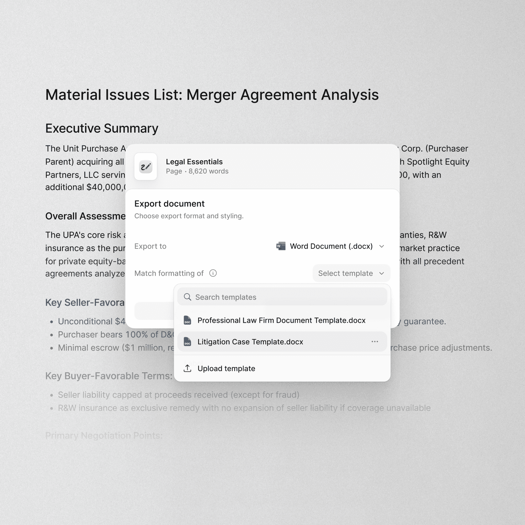 Create full documents based on analysis, reviews or research done in Legora, with citations to the underlying data, preserving context and legal nuance across sections.