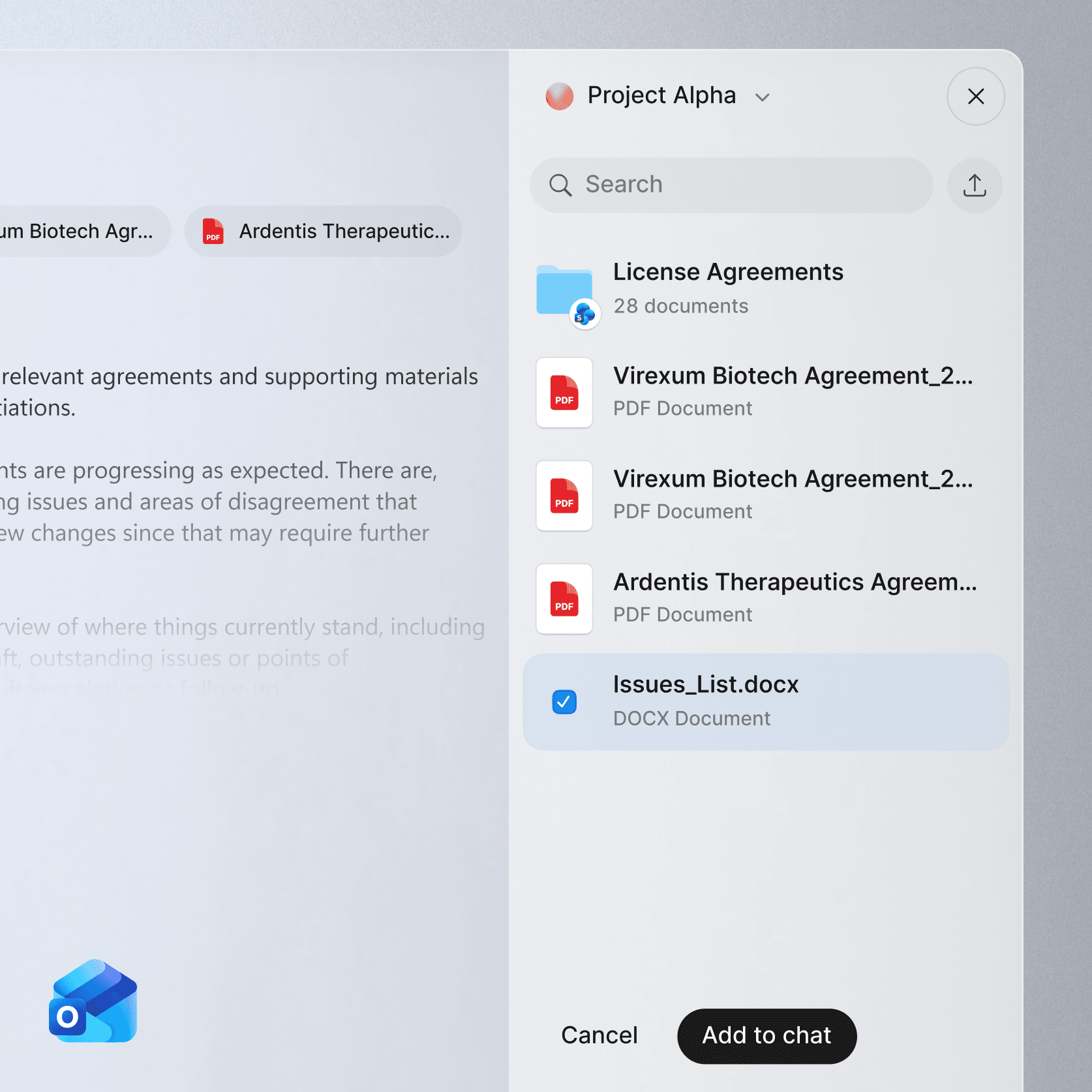 Attach and save documents and email threads directly to Legora in one click, keeping your documents organized, secure and instantly accessible.
