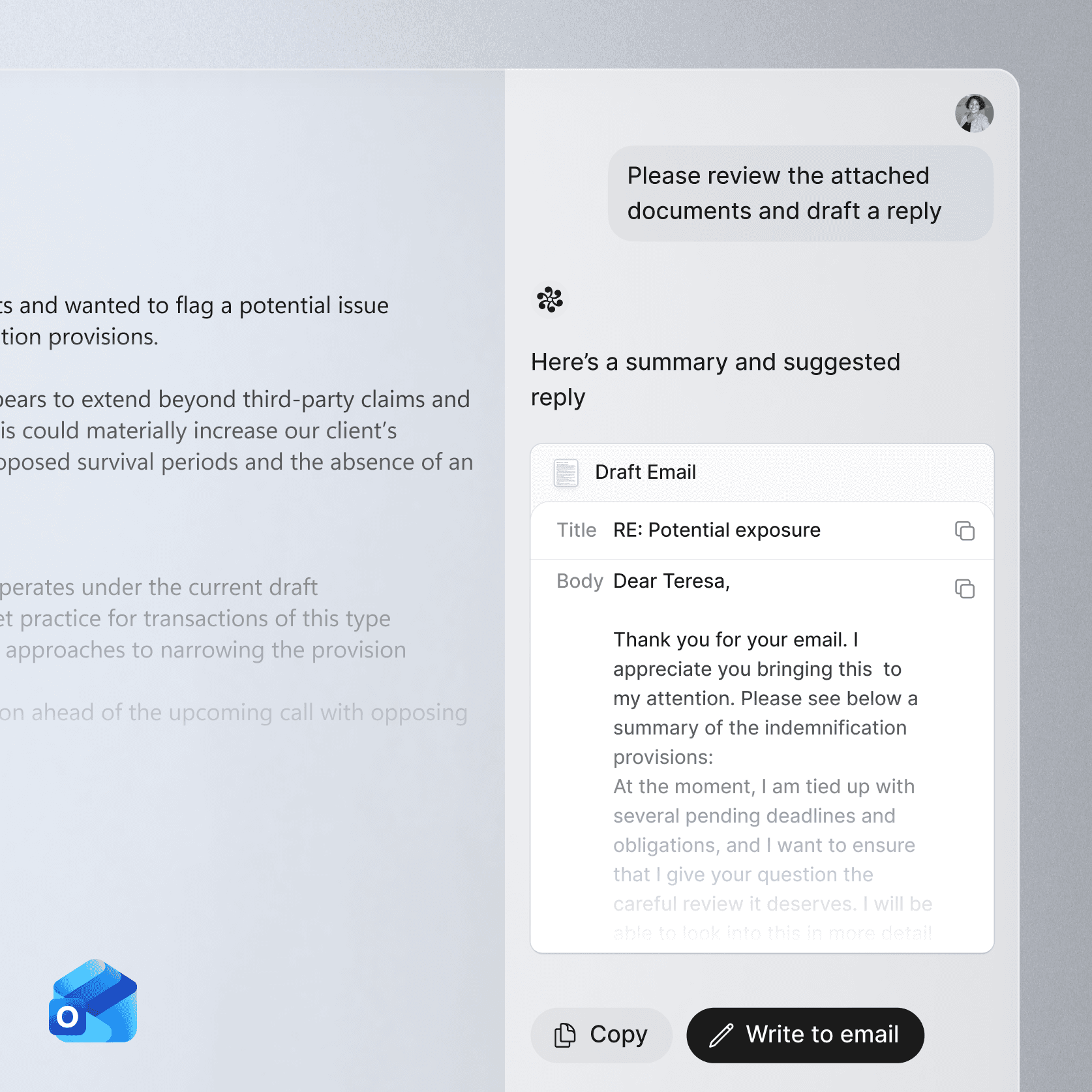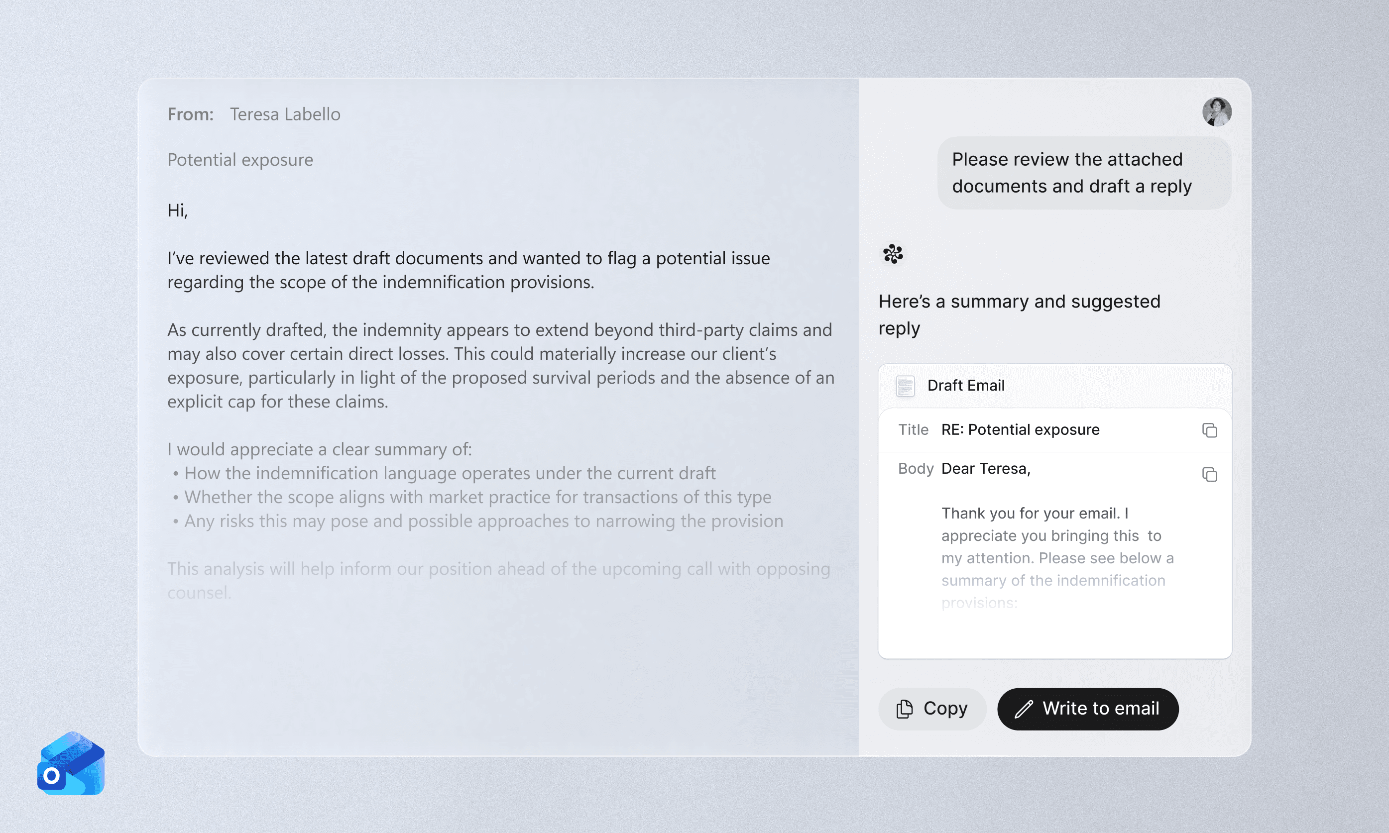 For most legal teams, email is where much of the work gets done, or grinds to a halt. With the Outlook add-in, Legora users can summarize long threads and draft precise replies in seconds, without leaving their inbox.