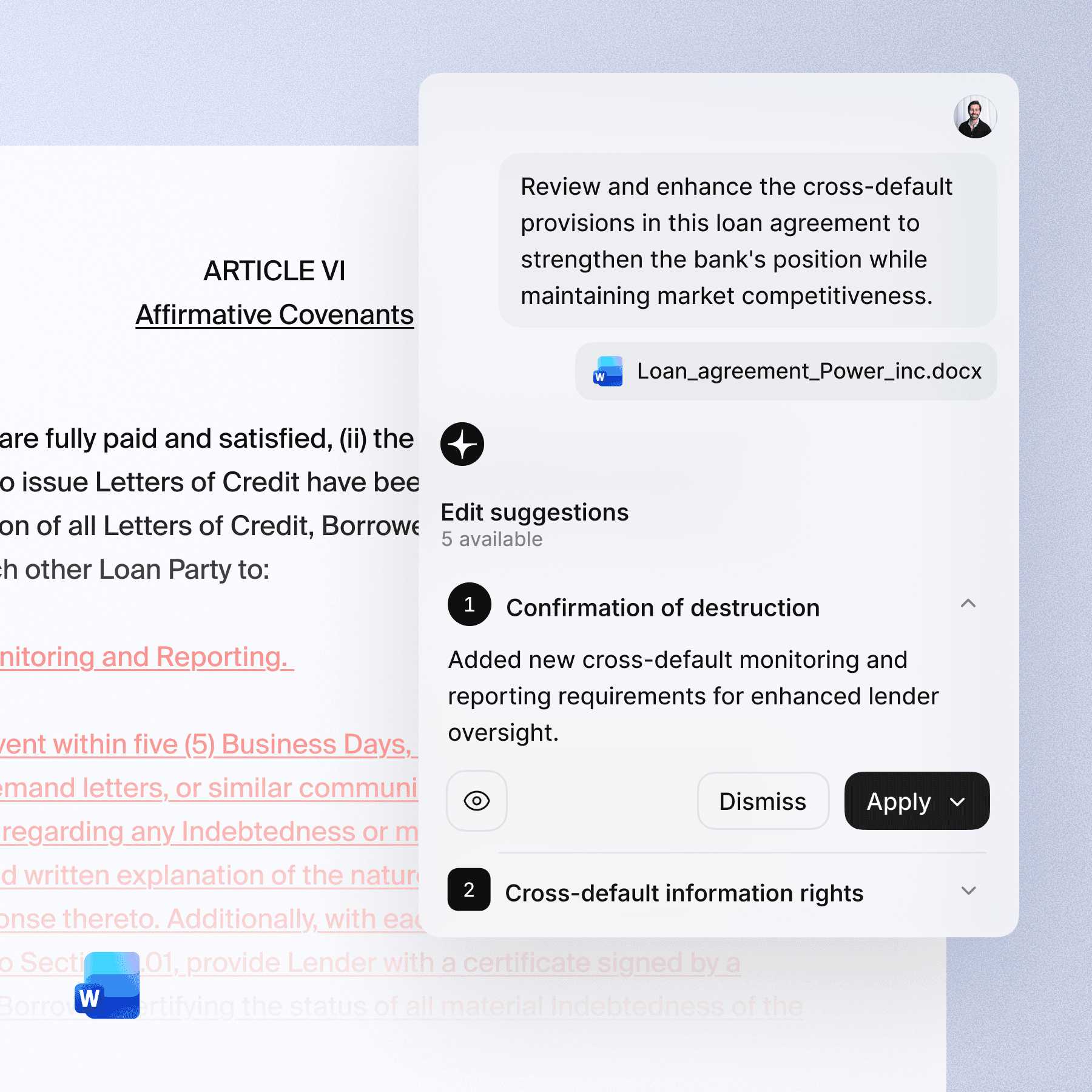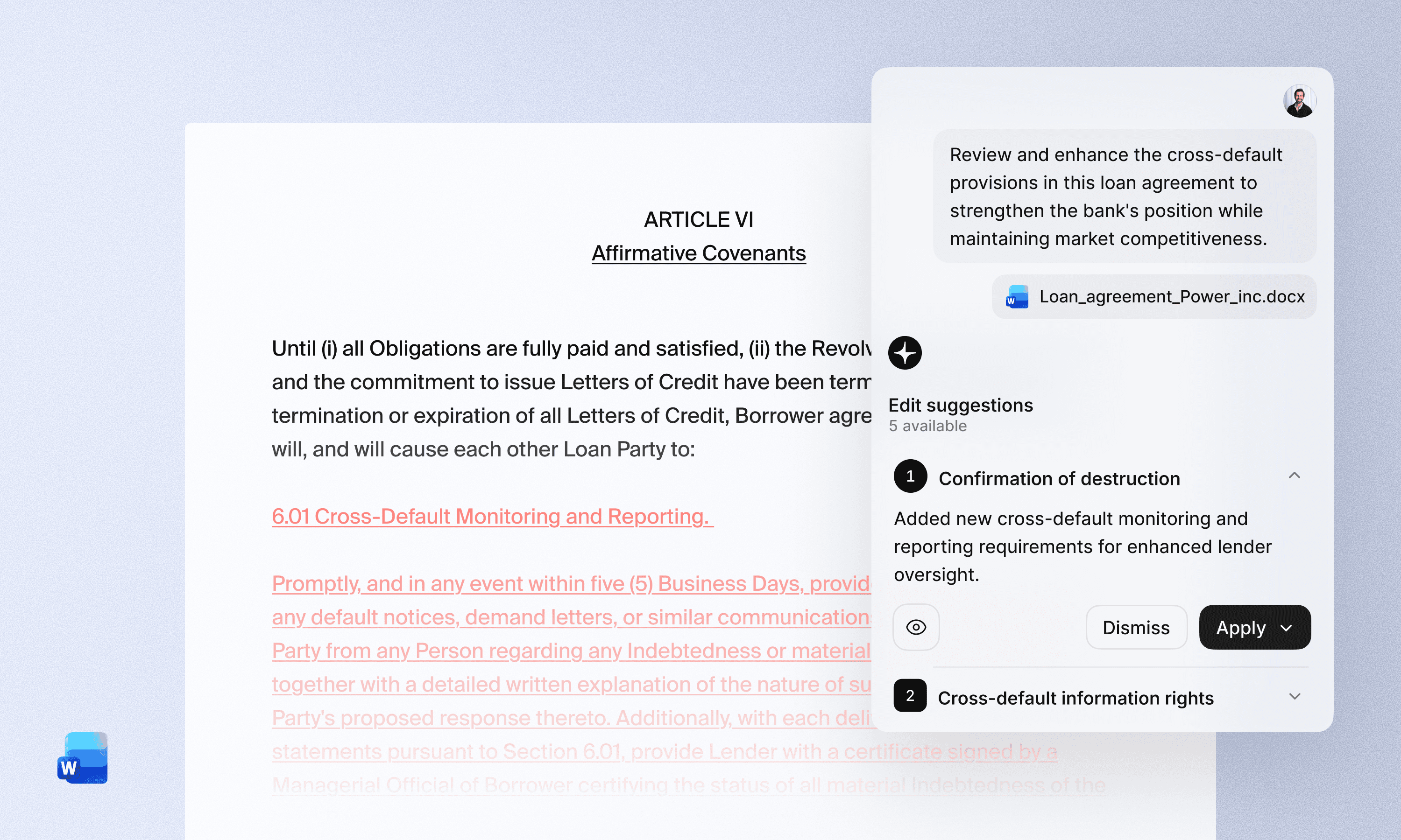 Legora enables legal, risk and compliance teams to uphold document standards by reviewing, redlining and seamlessly incorporating feedback—all without leaving Word.