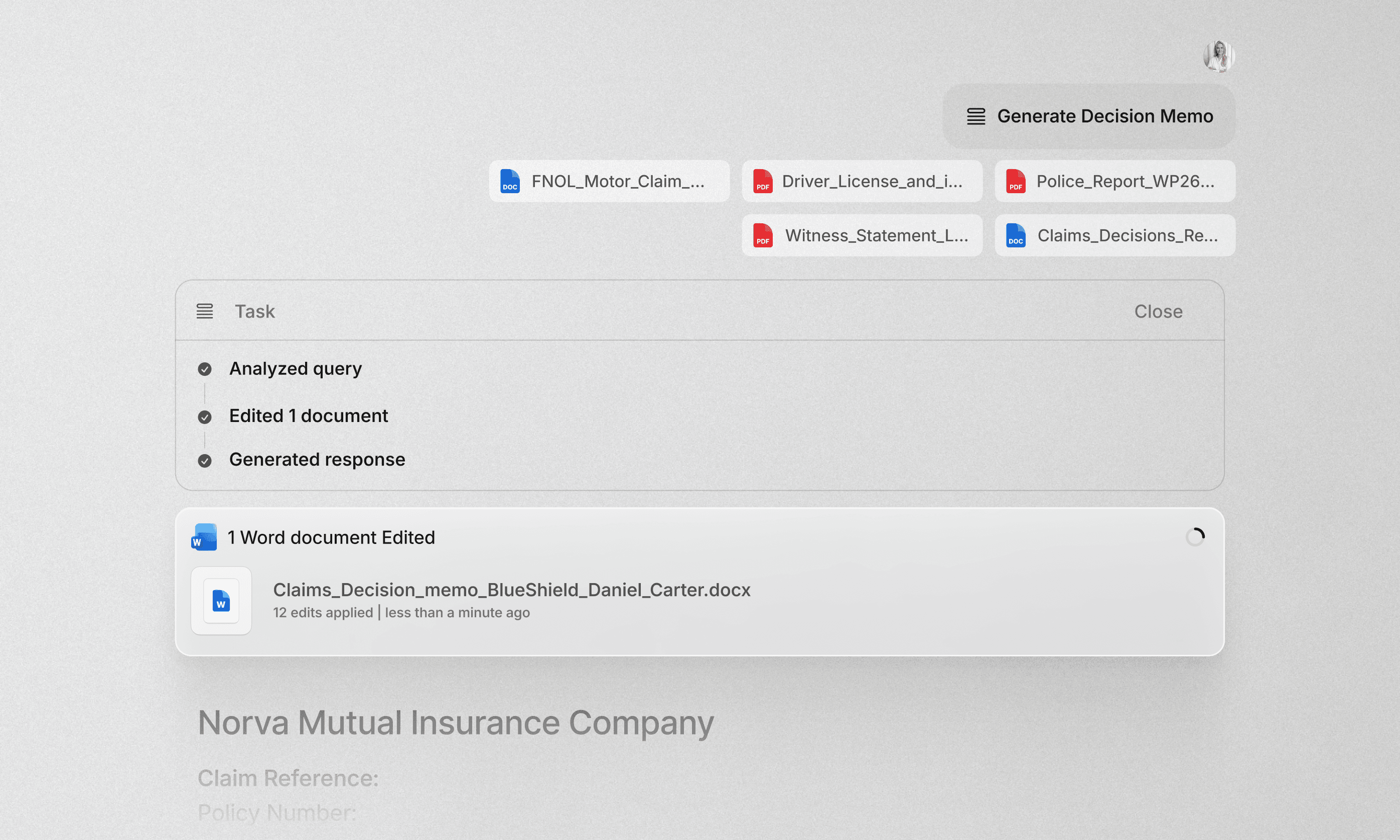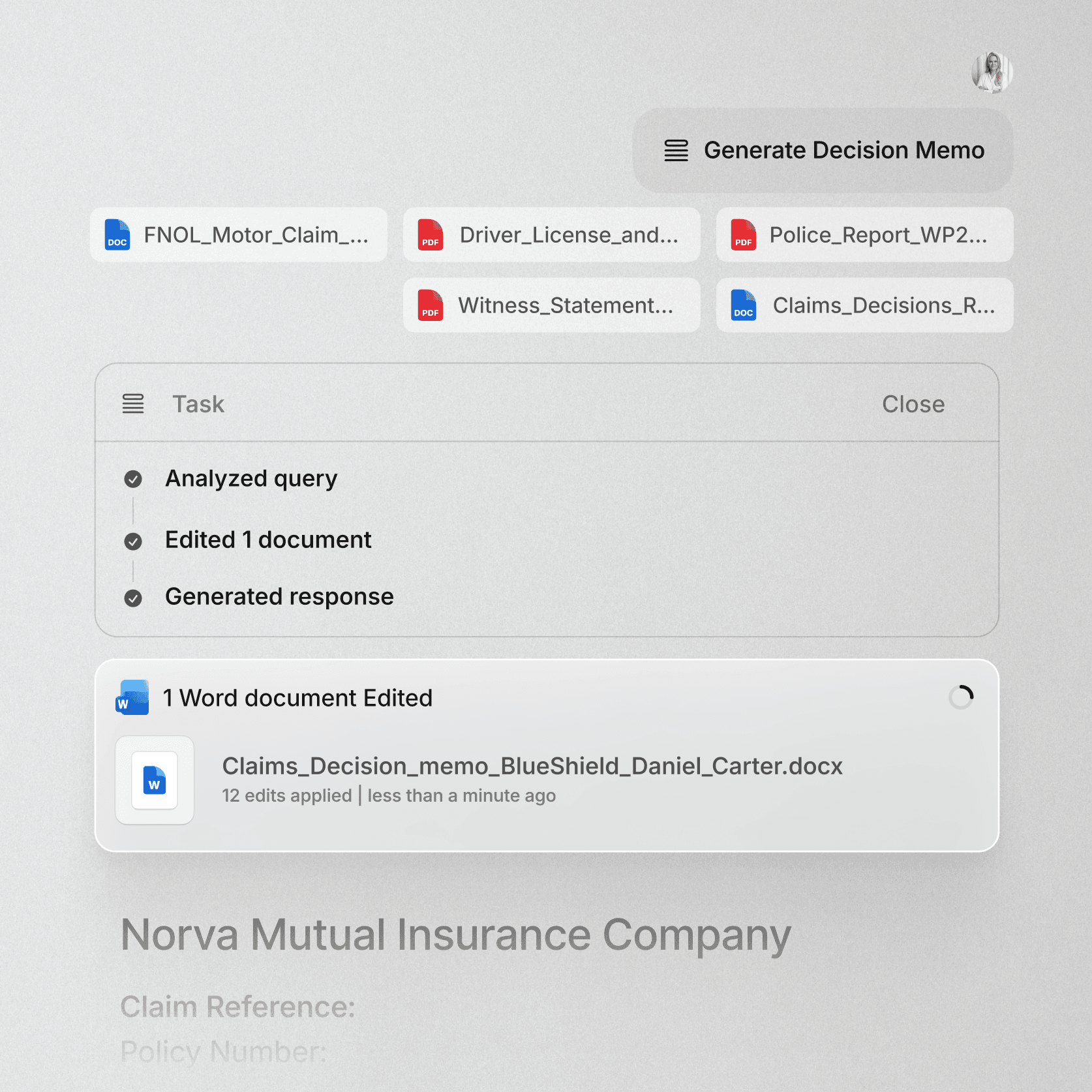 Once claims are triaged, Legora supports day-to-day claims handling by embedding legal intelligence directly into ongoing investigation and resolution. Apply policy terms, internal guidance, and prior interpretations consistently to reduce leakage, improving consistency across handlers, and strengthening defensibility across the portfolio.