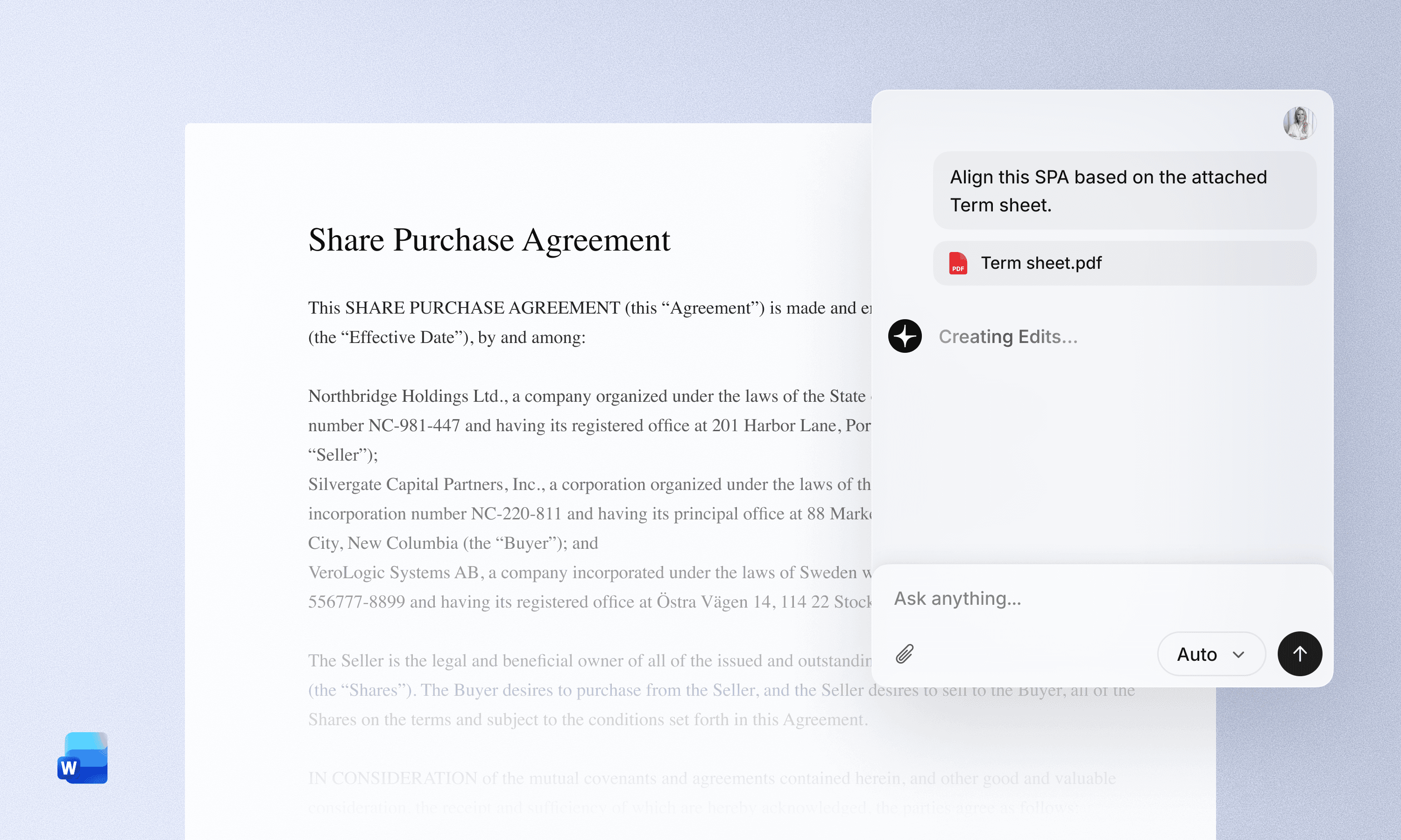 Compare the Term Sheet with the Share Purchase Agreement to ensure alignment, identify missing, modified, or expanded terms, and flag discrepancies. Then, quickly draft the SHA and MIP documents using the Word add-in based on these findings.