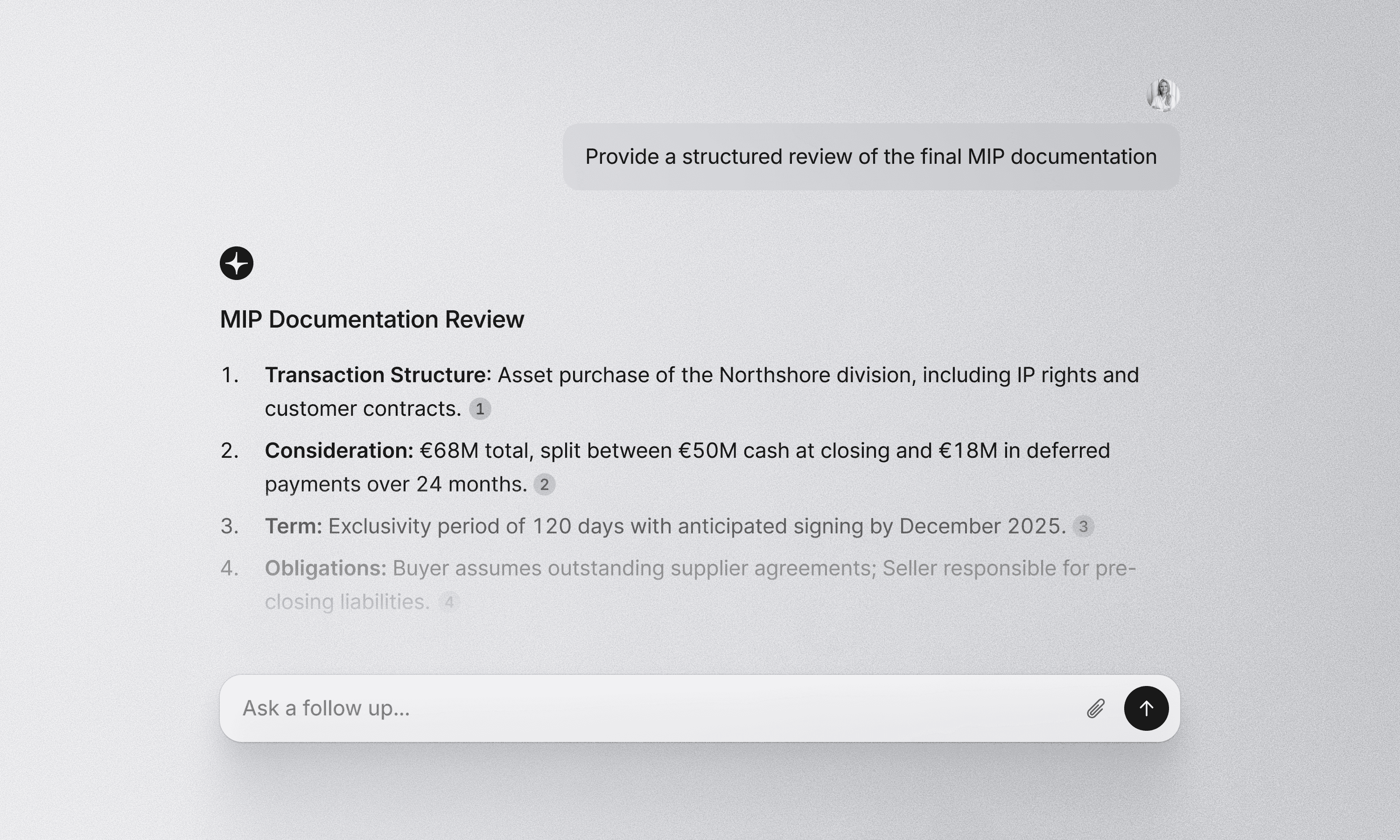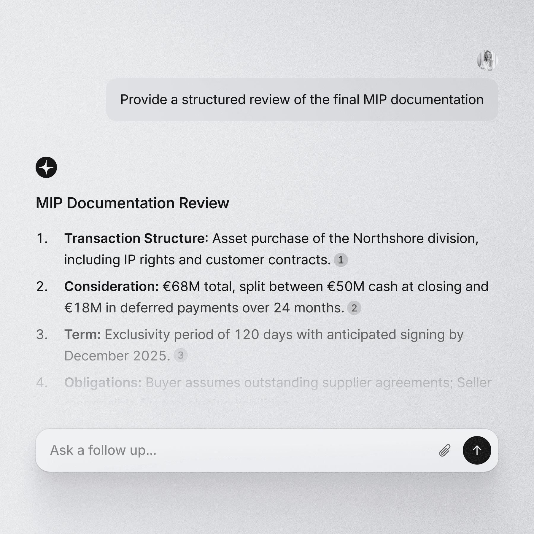 Review the final MIP documentation, summarize key terms, flag any unusual or complex clauses, and confidently base your decisions on the due diligence report.