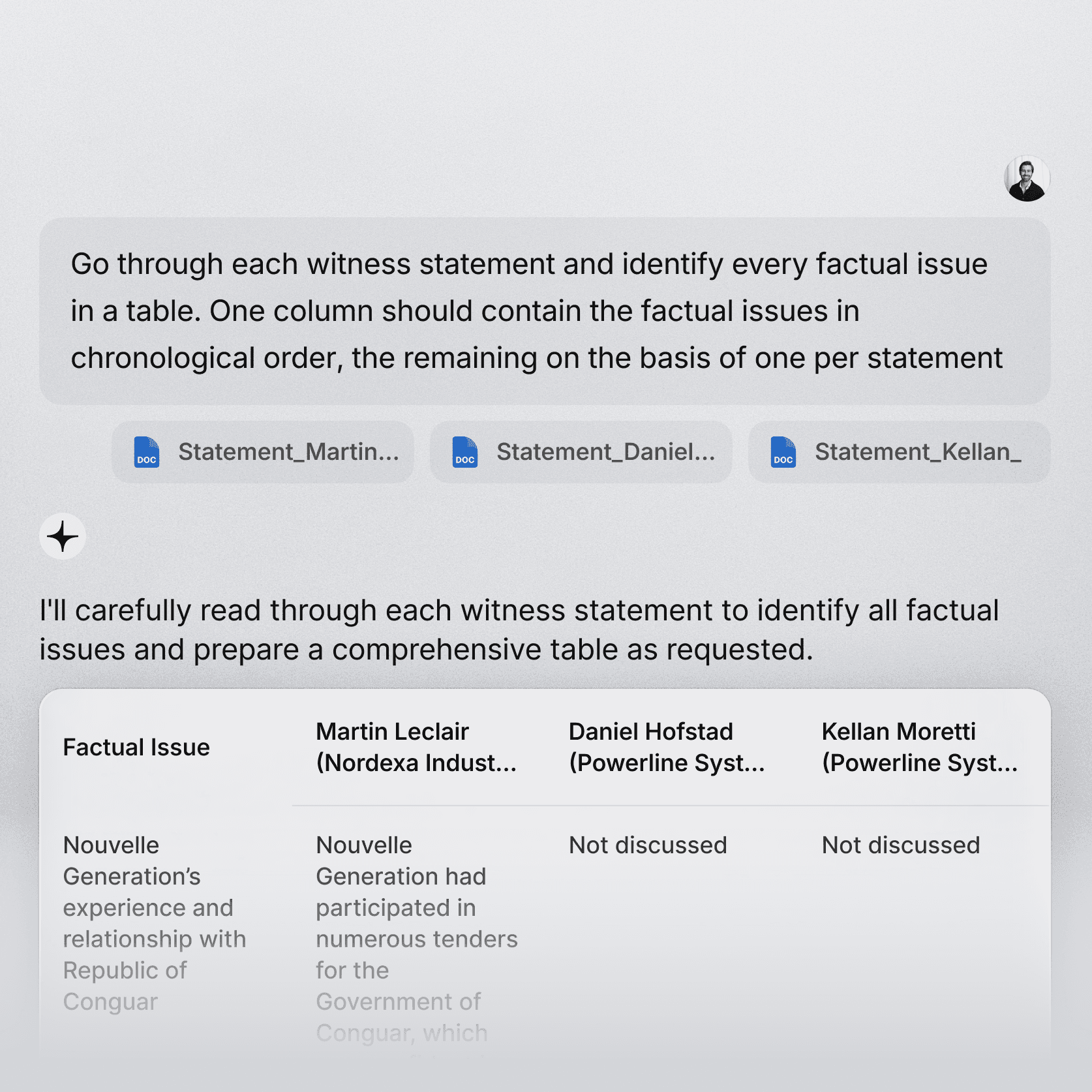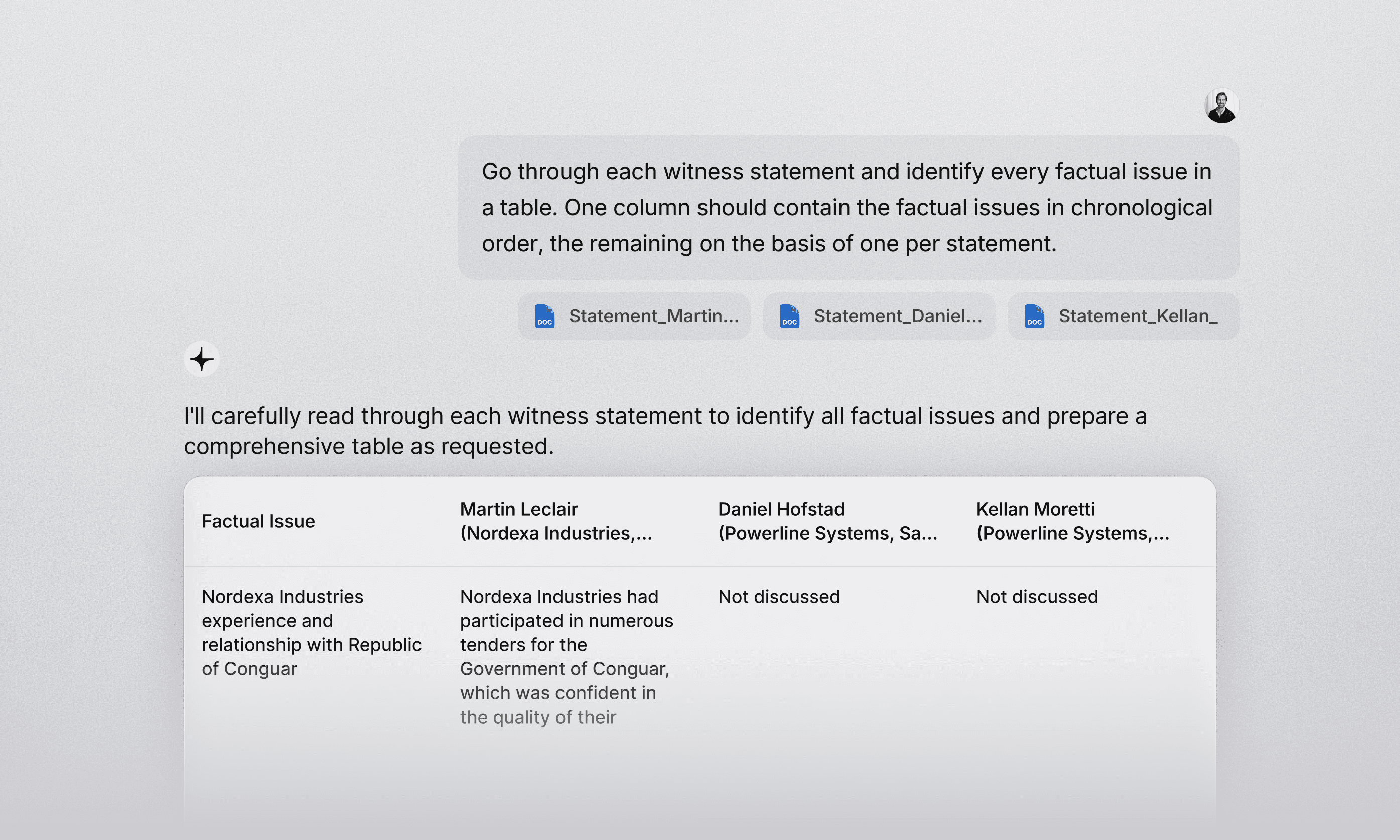 Assess case viability fast and reduce non-billable hours. With prompts like "Witness statement review", Legora highlights key evidence and inconsistencies in transcripts, giving lawyers a clear view of strengths and risks without manual review.